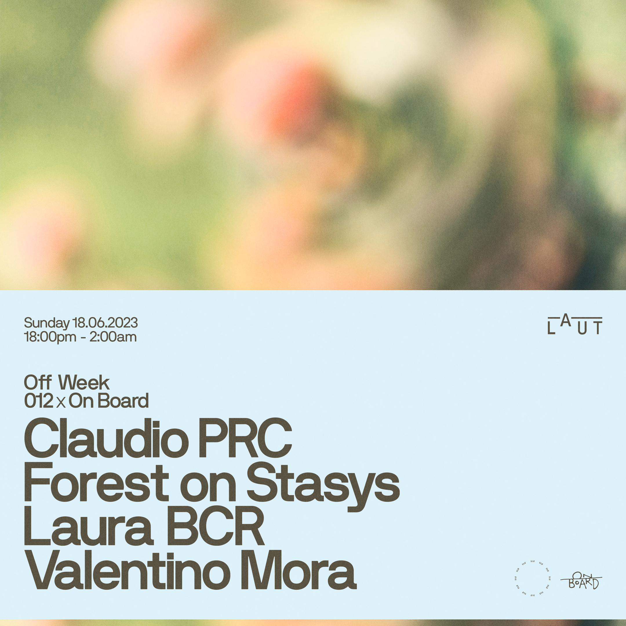 La conexión con el club fue tal que el artista italiano regresó a LAUT para despedir el año y recibir 2023, ocasión en la que Claudio PRC hizo para NYE un esperado All Night Long. Este 2023 On Board y 012 brindaron de nuevo en el club barcelonés un intenso y comentado (again) cierre de domingo Off Week, con Forest On Stasys, Laura BCR, Valentino Mora y Claudio PRC como artistas invitados, recibiendo como sorpresa especial a Luigi Tozzi, que hizo un live de una hora y repetía también por segundo año ante un público en plena sintonía con la alianza LAUT, On Board y 012.